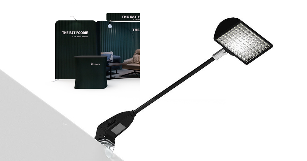 LED arm light with C shape clip,monitor bracketpacking box transformable to be a reception counter (black table top,dye sublimation graphic)