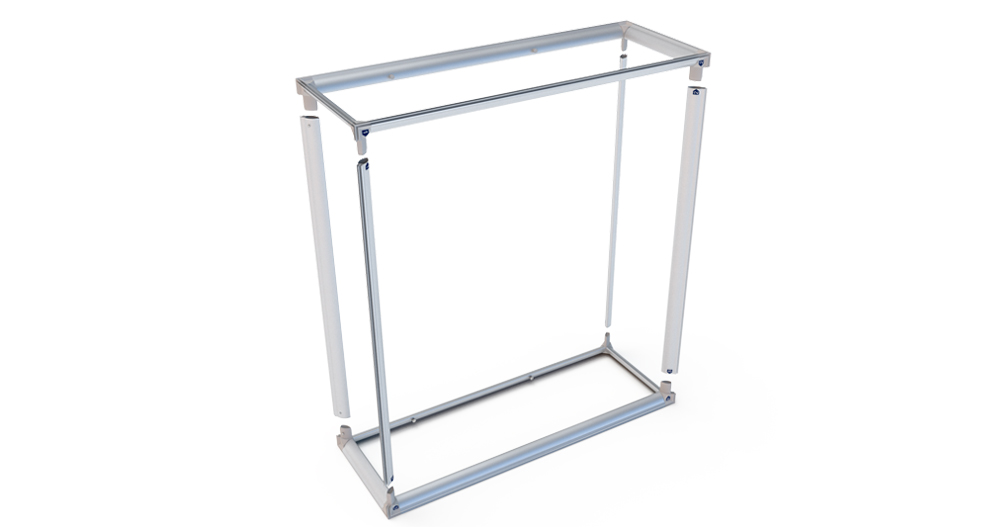 这是一款正面发光的接待桌,框架为铝管,表面为热转印画面。